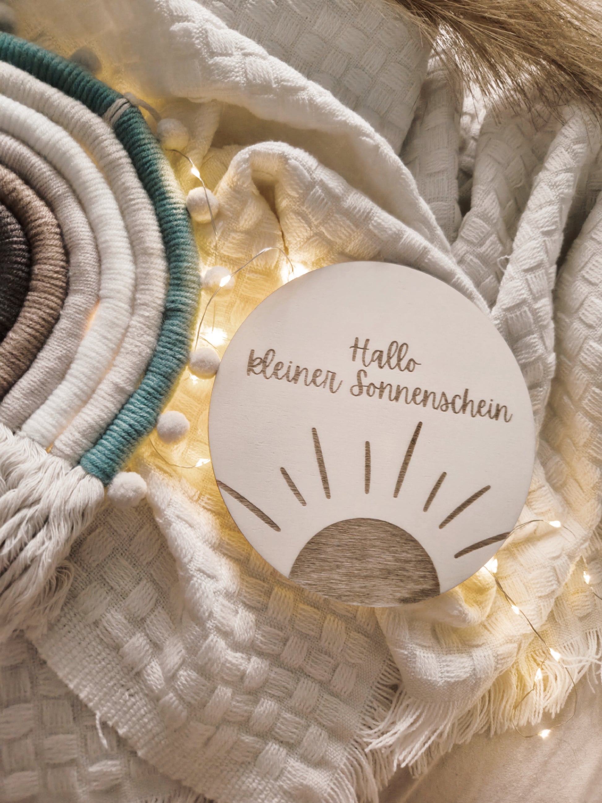 "Hallo kleiner Sonnenschein", ein liebevolles Dekorationsstück das Wärme und Freude in jedes Kinderzimmer bringt und durch liebevolle Details überzeugt. Ein perfektes Geschenk für neue Eltern, kleine Sonnenanbeter oder einfach als liebevolle Dekoration, die jeden Tag aufs Neue strahlen lässt. Größe und Design sind auf eine zauberhafte Atmosphäre abgestimmt – natürlich, warm und einladend.