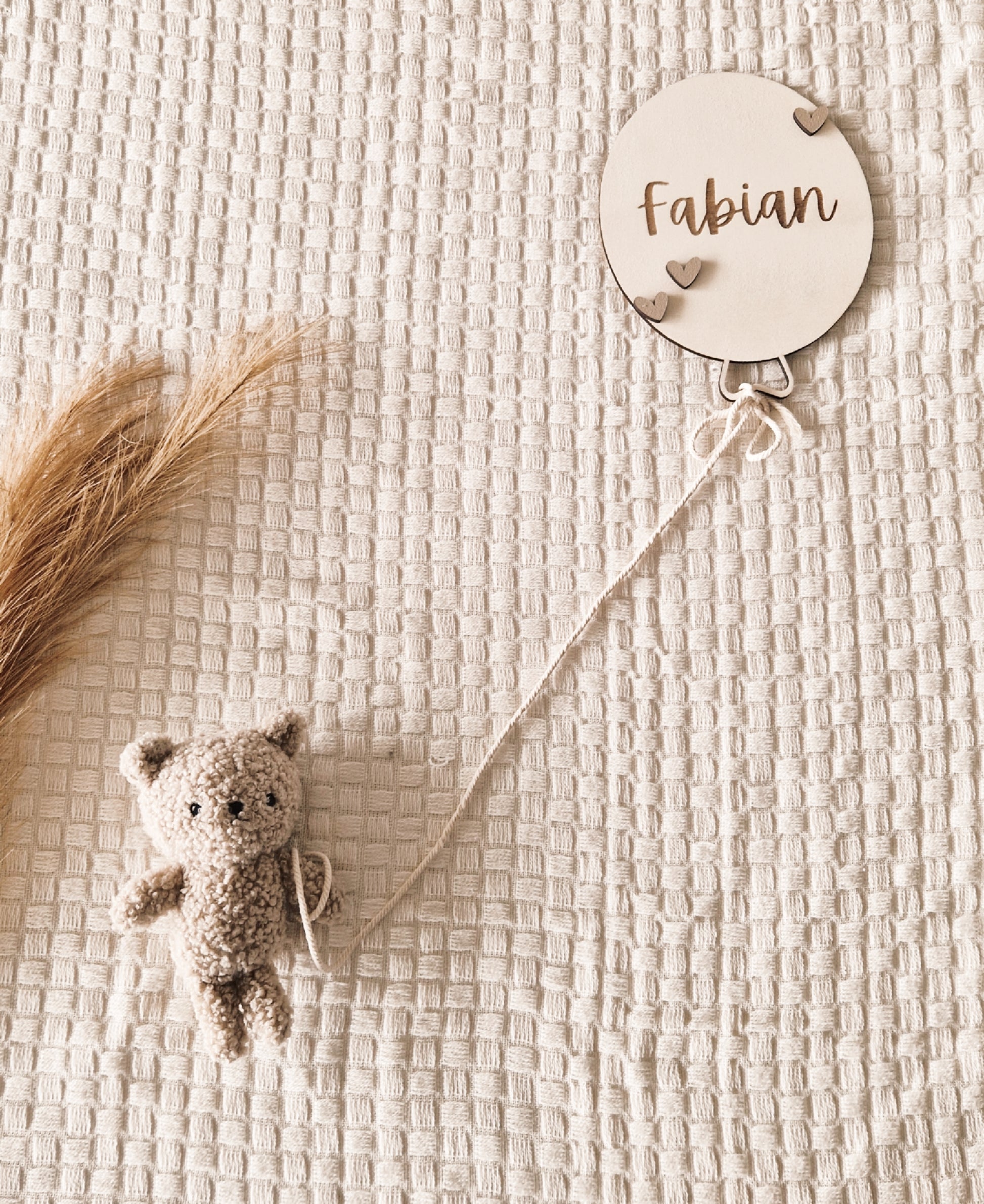 Dieses liebevoll gestaltete Namensschild im Luftballonmotiv ladet zum Träumen ein und bringt Leichtigkeit in jeden Raum. Aus hochwertigem Naturholz gefertigt und mit präziser Gravur versehen, wird jedes Schild zu einem ganz persönlichen Highlight. Das Schild wird mit deinem Wunschnamen personalisiert und ganz individuell für dich angefertigt.