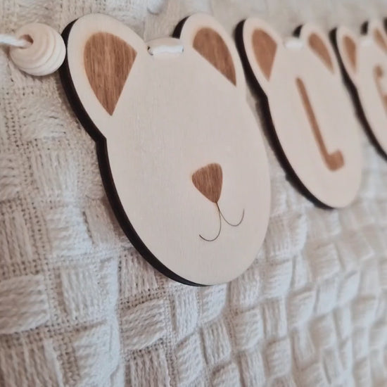Personalisierte Namensgirlande aus Holz im Bärenstil