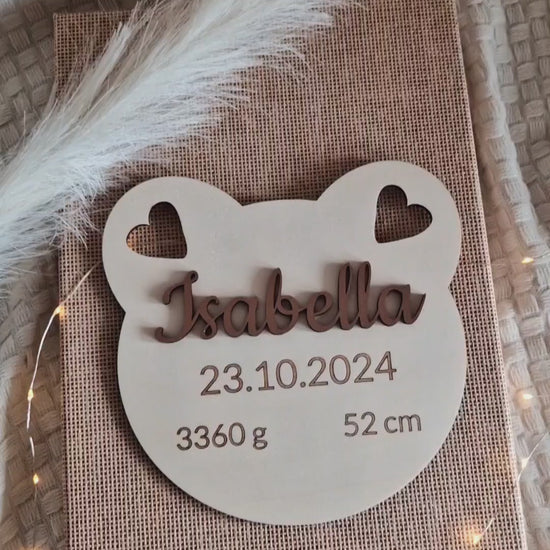Personalisierte Geburtstafel aus Holz im Bärenstil