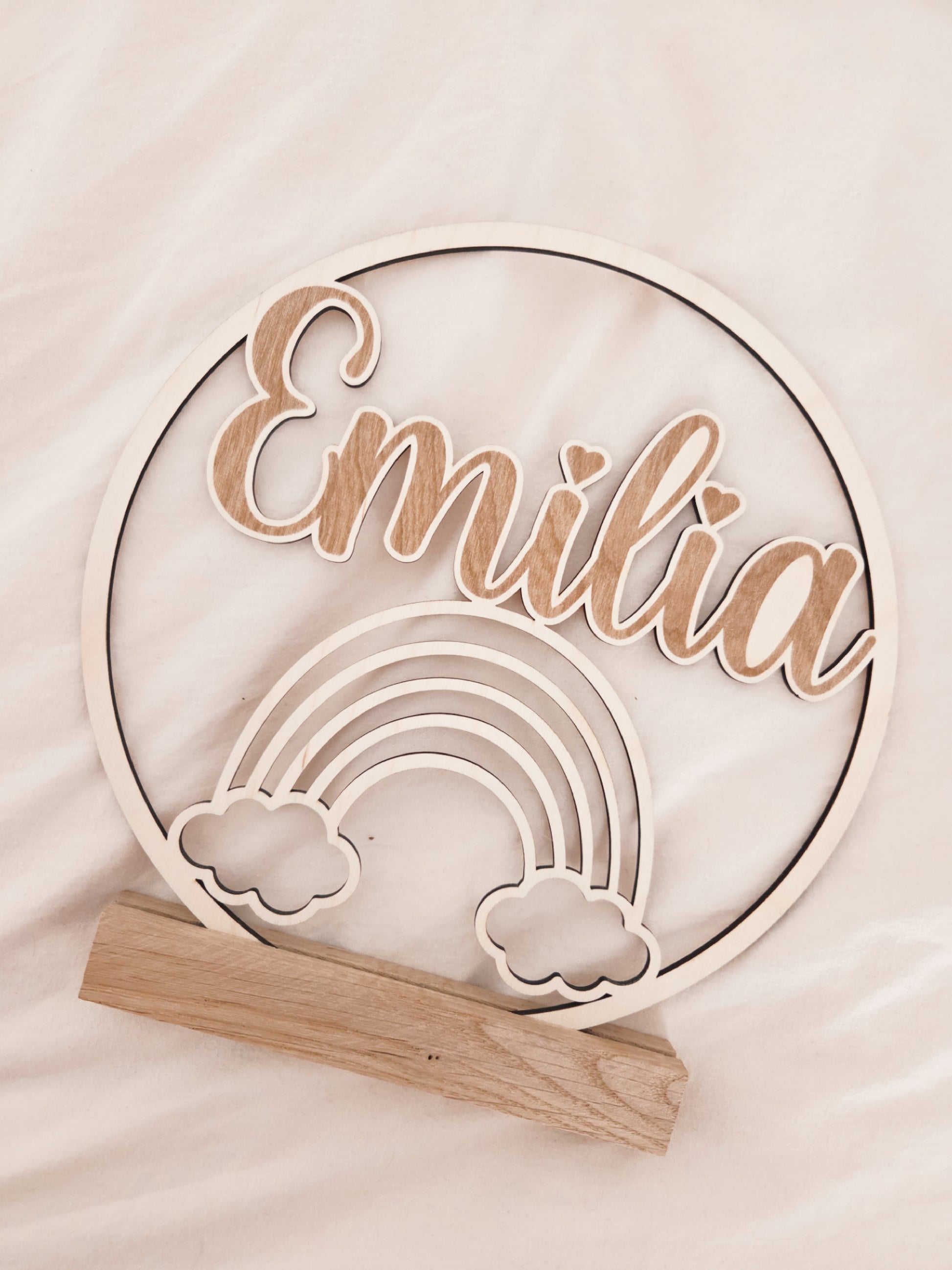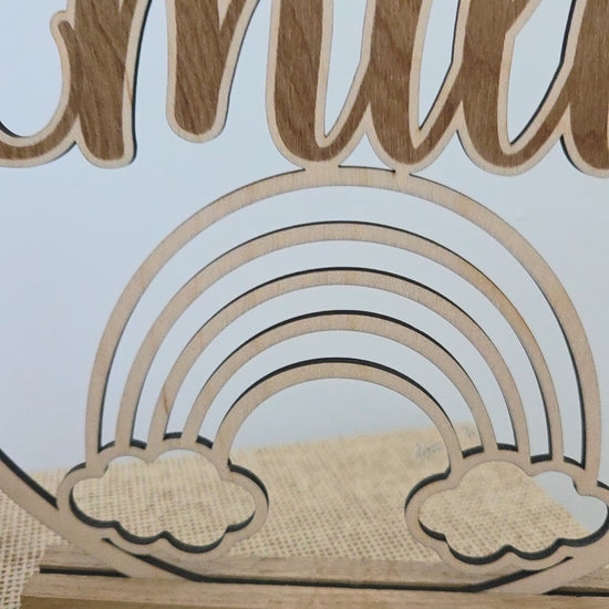 personalisiertes Namensschild aus Holz mit Regenbogen
