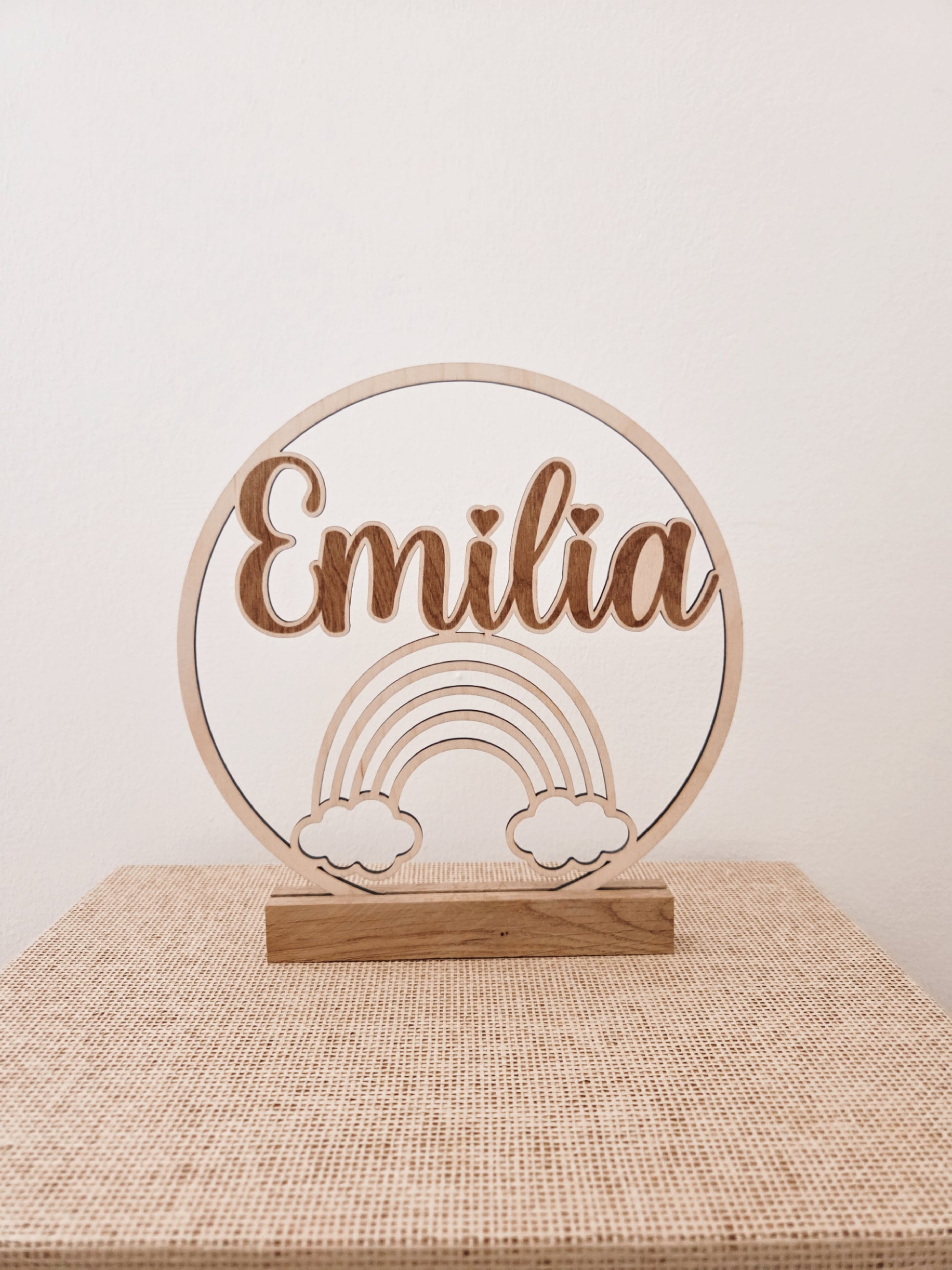 Ob im Kinderzimmer, auf dem Schreibtisch, im Regal oder als Geschenk – dieses Namensschild mit Steher steht stabil und setzt deinen gewünschten Namen perfekt in Szene. Der zarte Regenbogen steht für Freude, Hoffnung und Geborgenheit und macht das Schild zu einer besonders warmen und positiven Dekoration.
