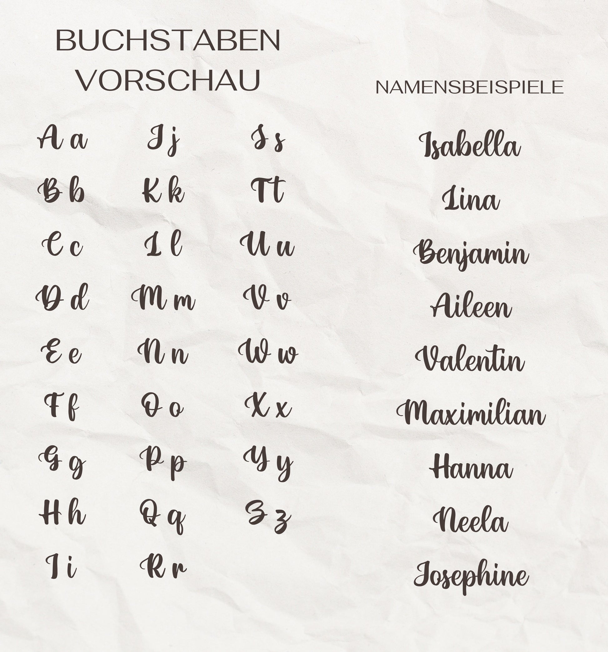 Sei dir bitte dessen bewusst, dass desto kürzer die von dir gewählte Länge und zeitgleich desto mehr Buchstaben der gewählte Name hat, umso filigraner der Schriftzug. ( Beispiel: auf 10 cm Länge ist Katharina viel feiner umgesetzt als Lena)